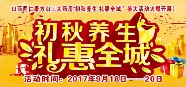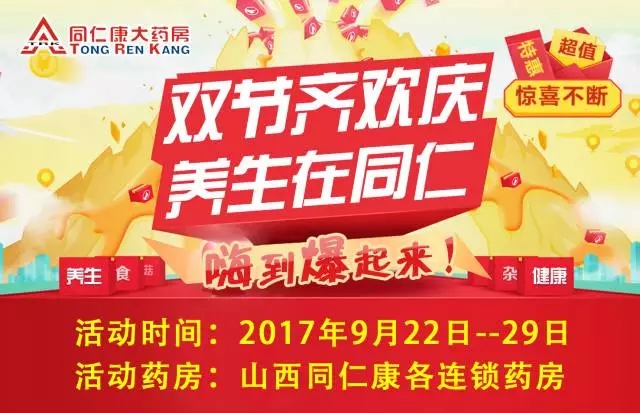 雙節(jié)齊歡慶 養(yǎng)生在同仁 活動時間:2017年9月22日—29日 活動藥房:山西同仁康各連鎖藥房......